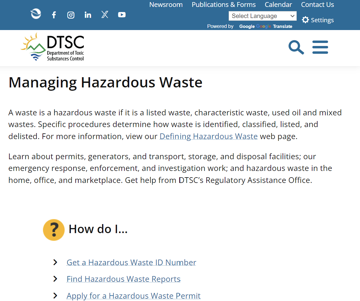 For a map of Household Hazardous Waste disposal facilities in California and tips for proper identification, management, and disposal, visit the California Department of Toxic Substance Control Household Hazardous Waste webpage.